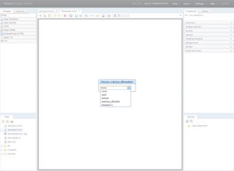 Maqetta se compone de un editor central y de una serie de módulos y pestañas laterales para la inserción de widgets, scripts, ficheros varios y para la depuración del programa resultante.